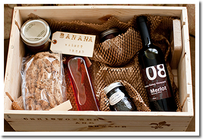 Our Sonoma Kit features: Grape Compote, 750ml Bottle of Sonoma Vineyard Merlot, Elderberry Syrup, Banana Bread in a Jar, and Spiced Bread